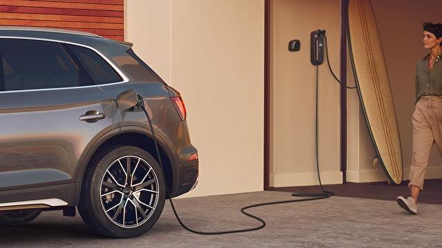 El sistema de carga e-tron compact, incluido de serie, te permite cargar fácilmente tu Audi Q5 TFSIe en casa. Este sistema consta de una unidad de control que incluye un cable de conexión al vehículo y dos cables de conexión a la red eléctrica (uno con un enchufe doméstico y otro con un enchufe industrial).