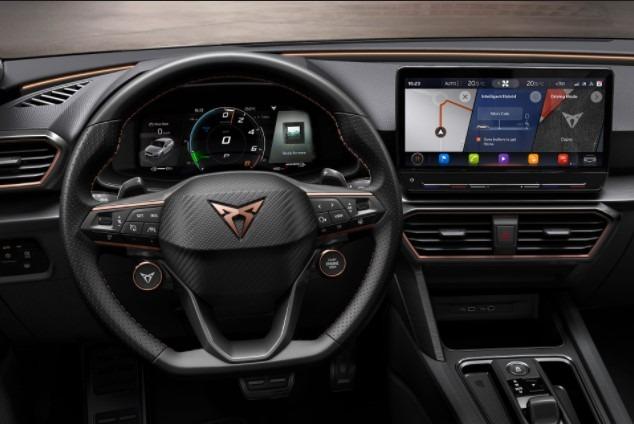 El volante del CUPRA León es de cuero e incorpora detalles en color aluminio oscuro y puntadas en color Copper. Una luz ambiente con intensidad del color ajustable aporta un acabado elegante y un doble asistente de seguridad.